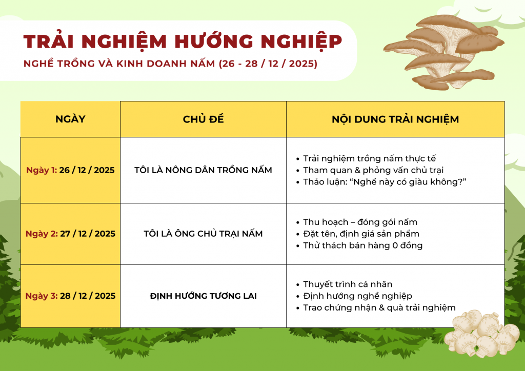 Chương trình Trải nghiệm hướng nghiệp Nghề Trồng & Kinh doanh Nấm được tổ chức nhằm giúp học viên tiếp cận nghề nông nghiệp hiện đại dưới góc nhìn trải nghiệm thực tế – tư duy kinh doanh – phát triển kỹ năng sống.